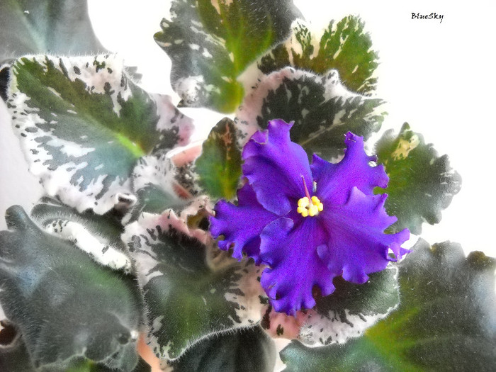 (S. Sorano) Single-semidouble plum and purple large frilled star/wide white edge, lavender and light plum tints. Variegated medium green and white, plain. Standard